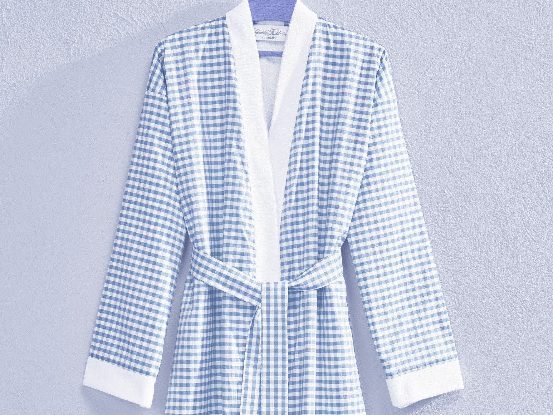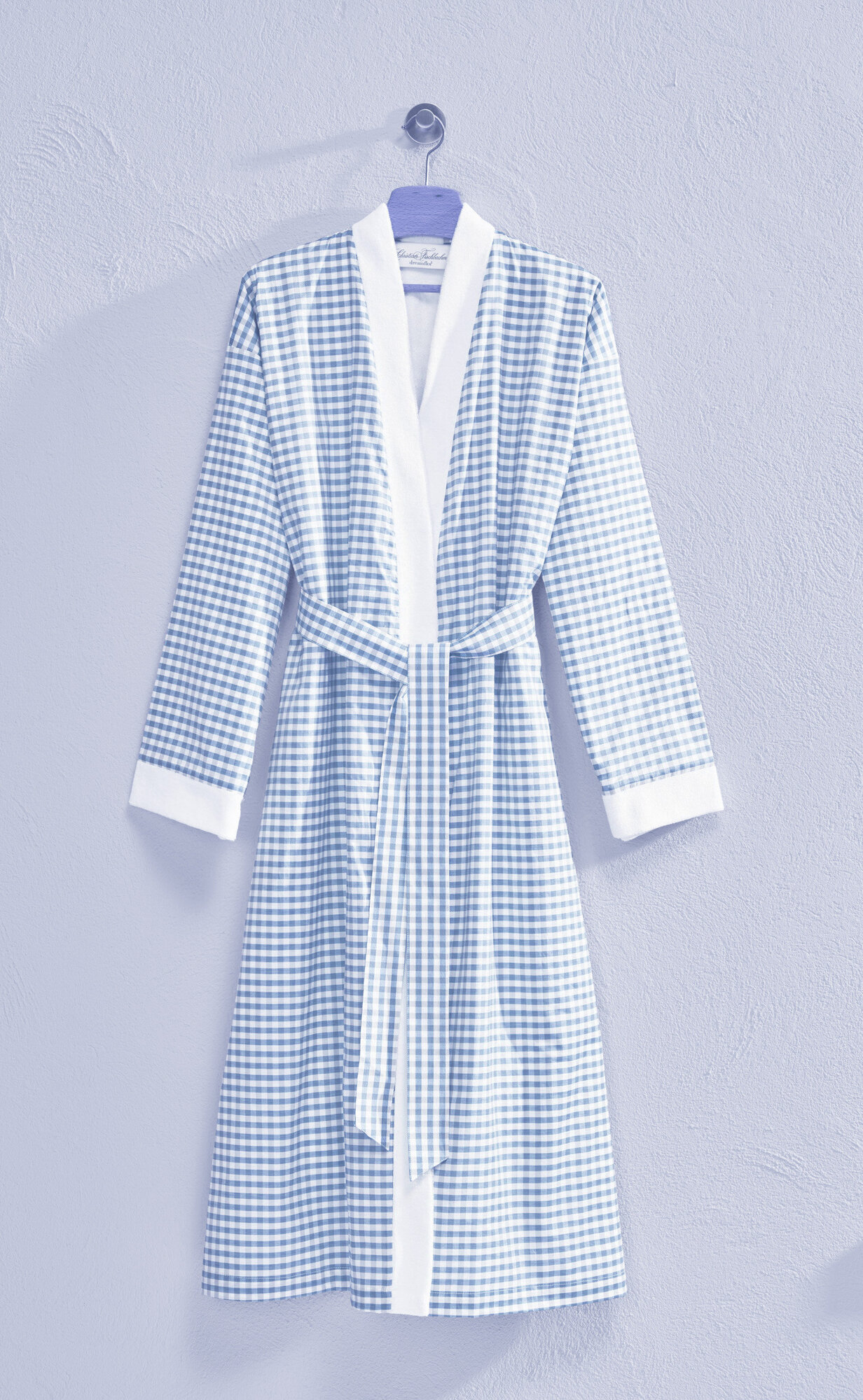 Женские халаты VICHY сатиновые с внутренней белой махровой тканью Dreamflor, изготавливаются по заказу в Швейцарии. Халат имеет кимоно-воротник и длину около 128 см. Он прекрасно дополняет как махровые изделия Christian Fischbacher VICHY, так и зимний дизайн WINTERMORGEN. Также доступен в красном A75.312.2